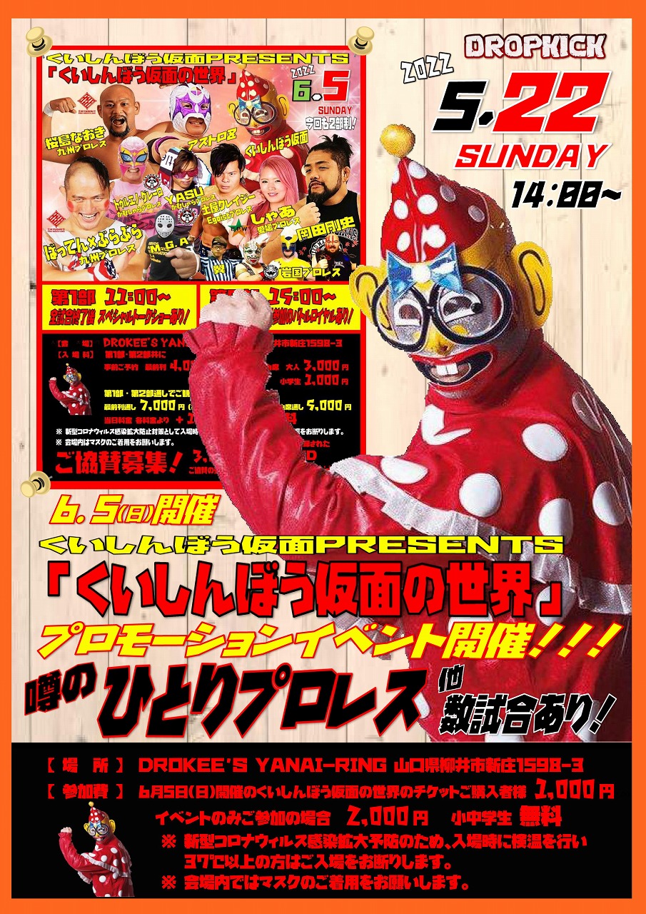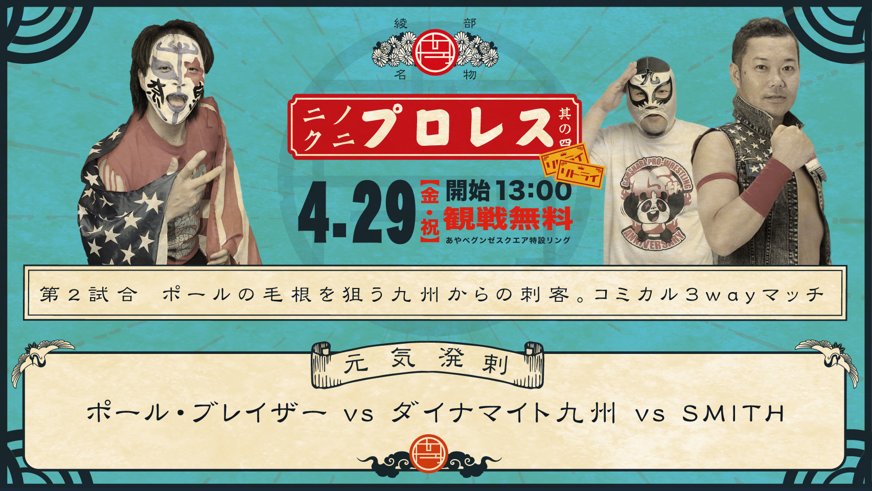 がむしゃらプロレスより、SMITH、ダイナマイト九州、陽樹、KENZO選手参戦!!